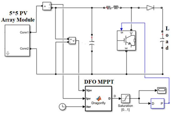 PV systems are frequently divided into grid-interfaced and stand-alone systems based on their possible applications. The schematic diagram of the grid-interfaced PV system under consideration is depicted in Figure 1. In addition to PV modules, a grid-interfaced PV system comprises PV arrays, a DC-to-DC boost converter, an MPPT tracker, DC-to-AC three-phase inverter, protective devices, and auxiliaries. The PV array under investigation comprises five parallel strings, each with five series modules. The maximum power point tracking (MPPT) technique controls the boost converter’s switching, which monitors the duty cycle. This research uses the dragonfly optimization (DFO) algorithm to regulate and control the DC-to-DC converter’s duty cycle, as reported in [43]. In order to integrate with the grid, DC power from PV modules must be converted to AC power using an inverter.