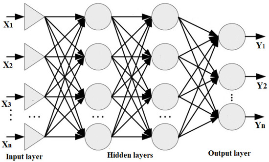 An artificial neural network having numerous layers between the input and output layers is known as a deep neural network (DNN). Data flows via neural networks in two ways: the multilayer perceptron (MLP) model is used to predict the output for the provided data in forwarding propagation, and the model updates its parameters in backpropagation based on the prediction error. Figure 6 depicts the MLP architecture utilized for fault classification. The feature vector is introduced into the model, and the output of the first and subsequent hidden layers is given by the Equations below.