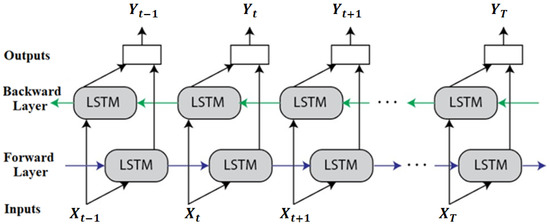 where LSTM (-) represents LSTM network, both the forward and backward LSTM layers’ weights at time t are denoted by and , respectively. The activation function is denoted by , while the bias of the output layer is indicated by .