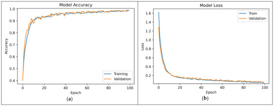 This section discusses the performance measurements required to evaluate and analyze the proposed DSEL algorithm on a noiseless dataset. This paper utilizes accuracy and loss as evaluation criteria to track training and validation performances. Accuracy is the percentage of data samples with correctly predicted labels. Loss is an error that measures how good the model’s output is compared to the ground truth label. Too many epochs overfit the training dataset, while too few underfit the model. The DSEL model was trained for 25–125 epochs to eliminate overfitting and improve generalization. After 100 epochs, model accuracy saturates, and validation error increases, which may indicate overfitting. Thus, the ideal epoch is chosen as 100. The progression of accuracy in training and validation throughout the training epochs for noiseless datasets is depicted in Figure 11a. When examining Figure 11a, it is clear that the overall accuracy improves over time and eventually reaches approximately 98.62%. The suggested DSEL algorithm model obtains many better-optimized parameters with each subsequent epoch until convergence, as evidenced by the constant improvement in training accuracy. Figure 11a illustrates that progressive gains in training and validation accuracy show no variance problem with the trained model. This lack of variance improves the model’s generalization to test data. Figure 11b shows the progression of training and validation losses over epochs. The better the model, the lower the convergence loss. A lower loss value at convergence indicates a more accurate model. Training and validation losses decreased simultaneously and converged around 0.056.