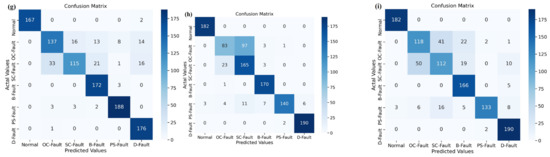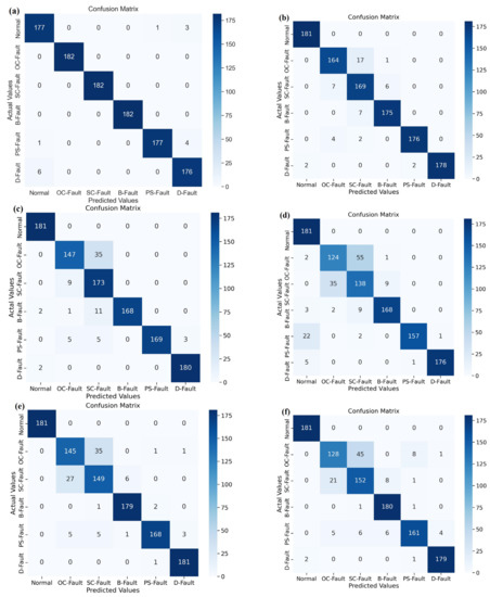 where and denote the mean and intensity of the disturbing pulse, random is the noisy default function, and represents the size of the disturbing signal. The distribution of noise generated for data samples of irradiance, temperature, voltage, current, and power is based on the following range of random noise amplitudes: Figure 15 displays a confusion matrix that evaluates the various PV-fault-diagnostic techniques in the context of a noisy dataset. The number of entries across a row of the confusion matrix represents the number of samples from a specific class in the tested dataset. Figure 15a demonstrates that the proposed DSEL fault-diagnosis algorithm under a noisy dataset classified 181 testing data samples from the normal (no-fault) category as belonging to the normal (no-fault) category, the 162 data samples from the OC-Fault category as belonging to the OC-Fault category, 21 data samples from the SC-Fault category as belonging to the OC-Fault category, three data samples from the PS-Fault category as belonging to the OC-Fault category, the 154 data samples from the SC-Fault category as belonging to the SC-Fault category, 19 data samples from the OC-Fault category as belonging to the SC-Fault category, three data samples from the B-Fault category as belonging to the SC-Fault category, two data samples from the PS-Fault category as belonging to SC-Fault category. The 179 data samples from the B-Fault category belong to the B-Fault category, and six from the SC-Fault category belong to the B-Fault category. The 177 data samples from the PS-Fault category belong to the PS-Fault category, one from the OC-Fault category belongs to the PS-Fault category, and one from the SC-Fault category belongs to the PS-Fault category. Lastly, the 182 data samples from the D-Fault category belong to the D-Fault category. Taking into consideration the indications, Figure 15a demonstrates that the fault-diagnosis accuracy of the proposed DSEL approach technique under noisy dataset conditions for Normal, OC-Fault, SC-Fault, B-Fault, PS-Fault, and D-Fault is 100%, 89.01%, 84.61%, 98.35%, 97.25%, and 100%, respectively. The proposed DSEL algorithm’s overall accuracy is around 94.87% under noisy datasets, as depicted in Table 4. The proposed DSEL approach has an outstanding classification impact under noisy dataset conditions and can greatly enhance the fault-diagnosis capabilities of PV arrays.