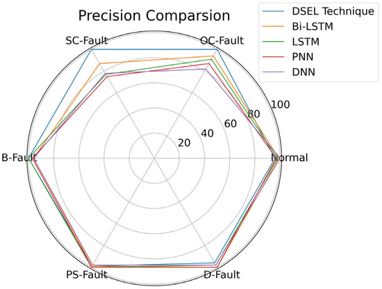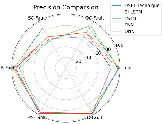 To further extend the validity of the proposed DSEL fault-diagnosis algorithm, a comparison can be made regarding precision among different fault-diagnosis algorithms (Bi-LSTM, LSTM, PNN, and DNN) with the help of a radar plot. As illustrated in Figure 14, the precision of the proposed DSEL methodology for normal, OC-Fault, SC-Fault, B-Fault, PS-Fault, and D-Fault is 96.12%, 100%, 100%, 100%, 99.27%, and 96.04%, respectively. Under the noiseless dataset, the suggested DSEL methodology’s overall precision is approximately 98.57%. Compared to other fault-diagnosis algorithms, Bi-LSTM, LSTM, PNN, and DNN achieve overall precisions of about 95.83%, 94.01%, 92.63%, and 91.97%, respectively. Consequently, it can be observed from radar plot analysis in Figure 14 that the proposed DSEL approach outperforms other strategies regarding PV-fault detection precision under a noiseless dataset.