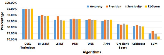 In addition, the fault-diagnostic results obtained using the suggested DSEL algorithm are compared to other AI-based fault-diagnosis techniques using the abovementioned metrics. Table 4 also depicts the accuracy, precision, sensitivity (recall), and F1-score achieved by various fault-diagnostic algorithms. Similarly, the confusion matrix obtained by utilizing the Bi-LSTM and LSTM algorithms is presented in Figure 12b,c. The accuracy achieved using Bi-LSTM and LSTM algorithms are around 95.66% and 93.35%, respectively, as mentioned in Table 4. Furthermore, the confusion matrices shown in Figure 12d,e provide insight into the efficacy of PNN and DNN algorithms. According to Table 4, the accuracy achieved by the PNN and DNN algorithms is approximately 92.11 percent and 91.89 percent, respectively. Similarly, the performance of ANN and Gradient Boost algorithms is depicted in the confusion matrix that is shown in Figure 12f,g. Table 4 shows that the accuracy of the ANN and Gradient Boost algorithms is about 90.37% and 87.83%, respectively. Correspondingly, Figure 12h,i depicts a confusion matrix that sums up the results of AdaBoost and SVM algorithms. As shown in Table 4, the accuracy attained using the AdaBoost and SVM algorithms is approximately 85.26% and 82.75%, respectively. In addition, a bar chart depicting performance metrics, such as accuracy, precision, recall, and F1-score for several fault-diagnostic algorithms, is provided in Figure 13. The SVM algorithm has demonstrated the lowest percentage of performance across all metrics. However, the proposed DSEL approach outperforms all metrics and has exceptional fault-diagnosis capabilities in PV arrays with a noiseless dataset.