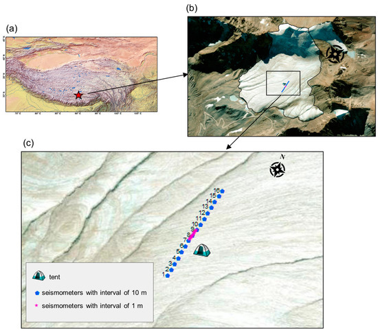 The installed FOSA consisting of 16 seismometers on the KQGR Glacier in the TP. (a) The study area. The red star marks the location of the KQGR Glacier. (b) The KQGR Glacier. The black box shows the location of the installed seismometers. (c) The installed 16 seismometers. The blue and pink pentagons are the seismometers with intervals of 10 m and 1 m, respectively.
