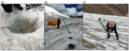 To study the glacial structure, active seismic sources were generated by hitting the glacier surface for 20 times using a heavy hammer of 7 kg (Figure 2c). The sources were arranged in a line with the seismic array. For the observation of the seismometer interval of 10 m, the sources were set as 15 m, 30 m and 50 m away from the seismometer No. 1. For 1 m, the distances between the sources and the seismometer No. 1 were 20 m and 50 m.