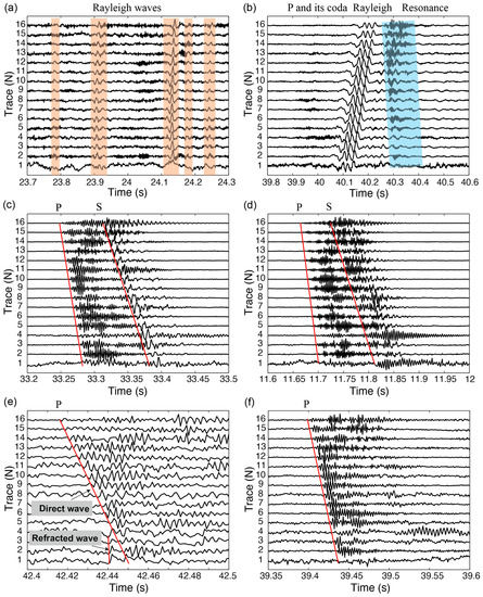 Numerous shallow icequakes occurred frequently and were visually identified. Figure 3a exhibits an example of the seismograms with lasting time of 0.6 s. There were at least five visible shallow icequakes (marked by orange shadows in the Figure 3a) that occurred with time intervals varying from about 0.05 s to 0.23 s. The lasting times for these icequakes were extremely short, no more than 0.03 s. Their waveforms were similar and dominated by obvious low-frequency Rayleigh waves.
