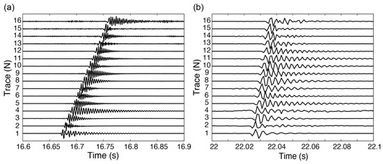 Vertical normalized seismograms of the hammer hitting recorded by the 16 fiber optic seismometers with intervals of 10 m (a) and 1 m (b). The offsets between the seismic source of hammer hitting and the seismometer No. 1 are 15 m in (a) and 50 m in (b). The origin times of seismograms are 16.6 s at 12:36 p.m. on 8 August (a) and 22.0 s at 11:47 a.m. (b) on 9 August 2021 in Beijing time.
