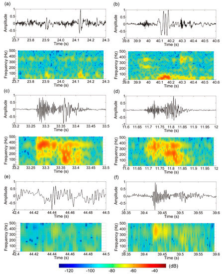 Different types of icequakes have different seismic sources and spectrum features [20]. We calculated the spectrograms of the seismic traces from the seismometers No. 2, 7 and 15 for the different types of icequakes. Although the energies for different frequencies may be affected by the response between the source and the receiver, these seismic traces generally show similar spectrum characteristics. Figure 5 shows the spectrograms from the seismometer No. 7. The main frequencies are less than 80 Hz for the shallow icequakes (Figure 5a,b). The seismograms of the deep icequakes (Figure 5c–f) show higher frequencies. The main frequencies of P wave and its coda wave are in the range of 300–400 Hz and 100–250 Hz for the S wave.