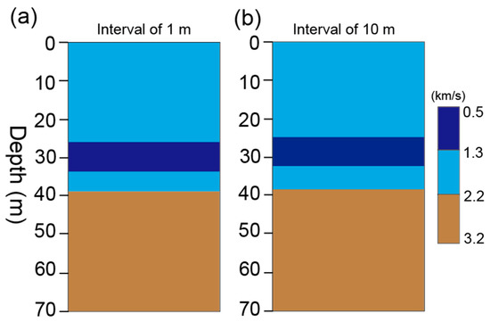 Estimated S wave velocity structure of the KQGR Glacier based on the seismograms from the 16 seismometers with intervals of 1 m (a) and 10 m (b).