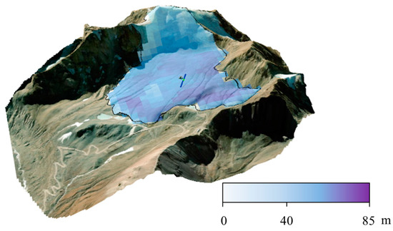 We obtained the seismic velocity structure of the KQGR Glacier in the TP for the two kinds of seismic arrays with intervals of 1 and 10 m, respectively. The results from the two seismic arrays show a similar glacial structure (Figure 6). There is a large velocity increment at a depth of about 40 m, depicting the ice–rock interface depth. The ice thickness model reveals a similar thickness of about 47 m, which is calculated based on the glacier surface motion and slope (Figure 7) [43]. Most importantly, our results reveal small-scale structure heterogeneity. A low-velocity layer is found at a depth of about 30 m with a thickness of about 7 m with a large S wave velocity drop of about 28%. A similar S wave velocity drop has also been observed at the polar ice sheets with a value of about 25% [19].