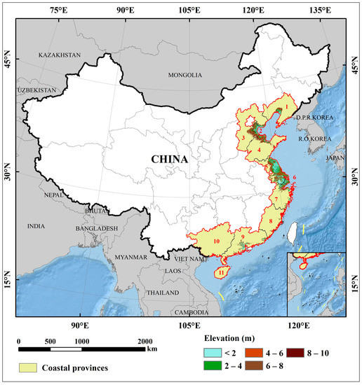 - Yang, X.; Yao, C.; Chen, Q.; Ye, T.; Jin, C. Improved Estimates of Population Exposure in Low-Elevation Coastal Zones of China. Int. J. Environ. Res. Public Health 2019, 16, 4012. [Google Scholar] [CrossRef] [PubMed]