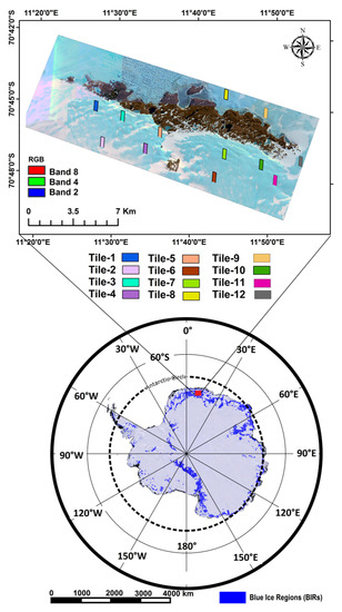Figure 1. Location of the Schirmacher Oasis depicted on a Landsat image mosaic of Antarctica (LIMA) (https://lima.usgs.gov/, accessed on 20 January 2022). Antarctic blue-ice regions (BIRs) (Hui et al. [22]) derived using ETM+ and MODIS data are depicted in blue on LIMA. WorldView-2 PAN-sharpened imagery shows the spatial distribution of the 12 tiles considered in this study. Each tile is a small subset of around 200,000 m2 area on the satellite image.