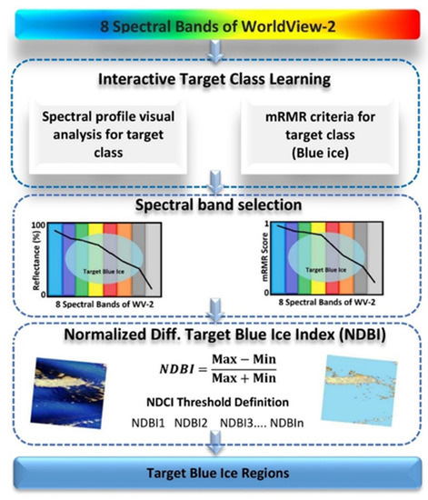 In this study, the new spectral bands (Coastal, Yellow, Red Edge, NIR1, and NIR2) and traditional bands (Blue, Green, Red) were ranked for maximum and minimum response values relevant to a classification; bands were also ranked using the mRMR criterion. We selected target blue ice regions in MSI and then found the combination of spectral bands that differentiated the target class. Spectral bands were ranked based on their ability to represent the target class (mRMR criterion), which was visually cross-verified. The bands ranked according to mRMR were empirically evaluated by observing the spectral profiles for BIRs. We evaluated nearly 1000 spectral profiles from the blue ice class to ensure the maximum and minimum response band. These bands were normalized to yield the normalized difference target class index (NDCI), in this case, NDBI. The detailed procedure of customizing NDBIs is described in Figure 4. The spectral profile analysis and mRMR-based scoring depicted in Supplementary Figure S4 show that the reflectance values range from 40–100% for blue ice and 95–100% for snow.
