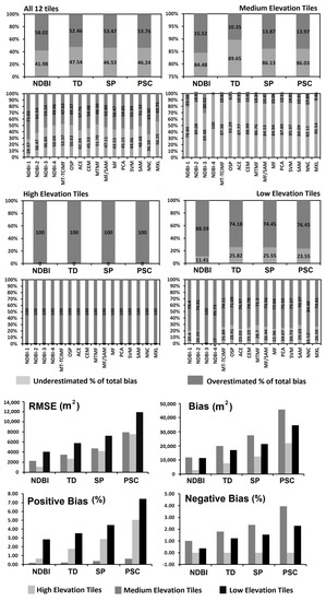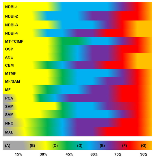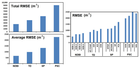 MT-TCIMF (positive bias 0.25 ± 0.03%, negative bias 0.27 ± 0.02%) and OSP (positive bias 0.31 ± 0.03%, negative bias 0.32 ± 0.02%) caused more overestimation compared to underestimation, while ACE (positive bias 0.33 ± 0.03%, negative bias 0.24 ± 0.02%) and CEM (positive bias 0.39 ± 0.03%, negative bias 0.32 ± 0.02%) caused more underestimation compared to overestimation. In terms of misclassified number of pixels, the TD approach rendered a total of 52.46 ± 2.33% (average 52.31 ± 2.33%) overestimated versus 47.54 ± 2.33% (average 47.69 ± 2.33%) underestimated pixels out of the total misclassified number of pixels (Figure 6). In general, the performance of the TD approach in terms of average RMSE was superior in comparison to the SP and PSC approaches, and inferior to the NDBI approach.