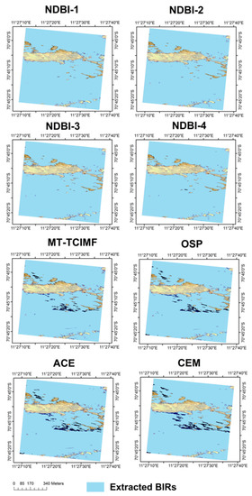 Figure 6. A visual image analysis of extracted BIRs from the sample Tile-1 using four NDBI methods under the customized NDBI approach and four supervised target detection methods under TD approach. Extracted BIR patches are appended on the WorldView-2 image (RGB: 8,5,1 band combination). The dark blue patches visible on images are non-BIRs.