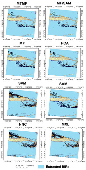Figure 7. A visual image analysis of extracted BIRs from the sample Tile-1 using four spectral processing methods under the SP approach and four supervised pixel-wise classification methods under the PSC approach. Extracted BIR patches are appended on the WorldView-2 image (RGB: 8,5,1 band combination). The dark blue patches visible on images are non-BIRs.