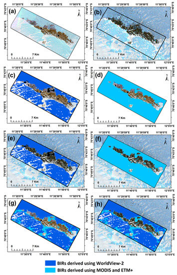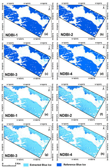Thereafter, the customized NDBIs were calculated against the values in the reflectance cube, and an output image was generated for each customized NDBI. Because of increased solar radiation meltwater accumulated on the surface of white ice, on the surface of frozen or semi-frozen lakes and on epishelf lakes, which produced a spectral response similar to NDBI. To discriminate between blue ice and meltwater on the surface of snow/lakes, it was essential to threshold the NDBI value so that the entire region was classified as the target class (blue ice) or a non-target class (snow, white ice, meltwater, frozen lake, epishelf lake). Since the BIRs exhibited NDBI values ranging from 0.84 to 0.96, a scene-dependent threshold was defined and used to discriminate between blue ice and non-blue ice pixels. Threshold values used in this study were empirically evaluated by manually scrutinizing the most obvious 1000 blue ice pixels from the NDBI images obtained from the PAN-sharpened images. Analyses were performed at the same pixel locations for all NDBI images derived from PAN-sharpened images to verify unbiased accuracy analysis. Table 3 summarizes the thresholds defined for the customized NDBI methods. A detailed description of the thresholding process is given in Supplementary Material S1. Pixels with higher NDBI values than the local threshold were coded as 1 (target blue ice class pixels), while pixels with a lower NDBI value were coded as 0 (non-target class pixels). After classifying the image based on each customized NDBI, semi-automatically extracted BIRs were vectorized to compute the area. Customized NDBI-based extracted blue ice area (m2) and the bias (m2) with respect to the reference digitized blue ice area (m2) for all 12 tiles are summarized in Table 4.