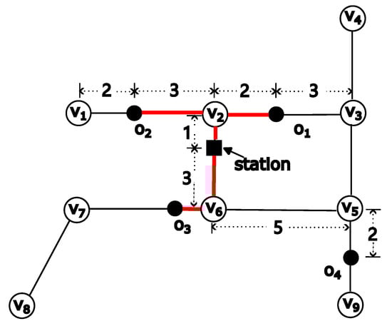 In Figure 1, the shortest paths between the station and , , and are highlighted in red. In Figure 1, the distances between the station and , , and are 3, 4.