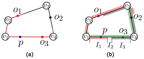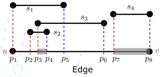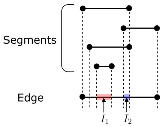 Consider the example in Figure 5. The endpoints of the segments divide the edge into several disjoint intervals. In the example, , …, are the endpoints of four segments. We mark the left endpoints in red and the right endpoints in blue.