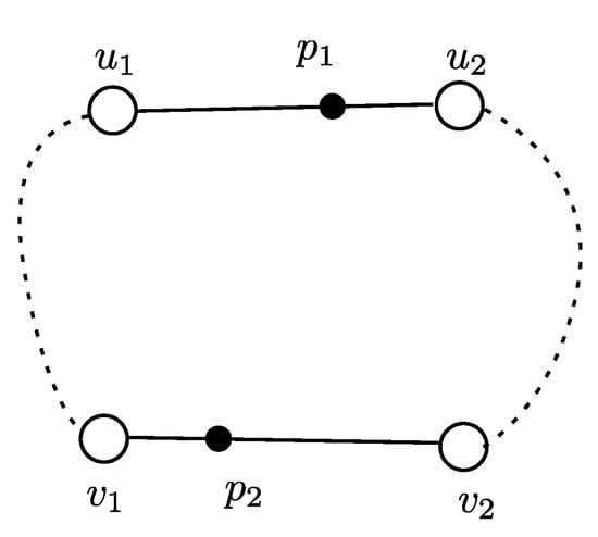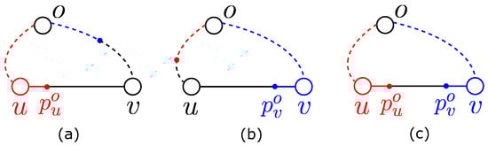 According to the definition of partially covered objects, we consider the following three cases: (1) As shown in Figure 4a, only the points on the interval can reach o within through node u; (2) only the points on the interval can reach o within through v; and (3) points on both intervals and can reach o within through u and v, respectively. By considering the three cases, we can easily derive the inequalities in the lemma. □