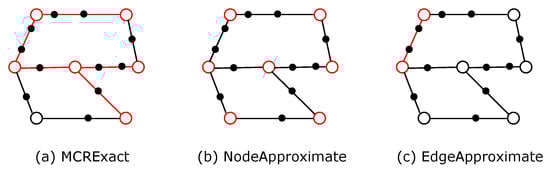 Before we present the approximate solutions, we first analyze the search space of the exact algorithm MCRExact. Recall that we computed the upper bound for each edge in the network. The edges are searched in a greedy manner until the upper bound of the remaining edges is smaller than the current result. As shown in Figure 7a, the edges that are searched are marked in red. Apparently, it takes most of the runtime to search the edges. There are infinite candidate locations on each edge. Even though we constructed a corresponding MOI problem and reduce the search space from infinity to , it is still inefficient when there are many spatial objects. Moreover, when the network consists of many edges, the total runtime will be much longer. Thus, to achieve better efficiency, we propose two approaches, namely NodeApprox and EdgeApprox, which will be elaborated on next.