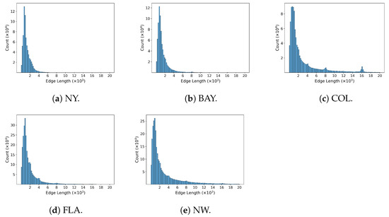 Datasets. In this paper, we use five real-world public datasets, namely NY, BAY, COL, FLA, and NW (http://www.diag.uniroma1.it//challenge9/download.shtml (accessed on 31 January 2023)). These datasets are the road networks in New York City, San Francisco Bay Area, Colorado, Florida, and Northwest USA, respectively. In the road network, each edge represents a road segment and its weight is the physical distance of the road. For each dataset, we randomly generate spatial objects and place them on the road network. Specifically, the number of spatial objects on an edge is proportional to , where / is the degree of node u/v, and is the length of the edge. Informally, if an edge is connected to nodes with a higher degree, or if the edge is longer, it is likely to hold more spatial objects. Each edge holds about 15.2 spatial objects on average. The details of the five datasets are reported in Table 1. We illustrate the distribution of edge lengths in each dataset in Figure 8. As can be observed from the figure, the lengths of most of the edges are smaller than 6000.