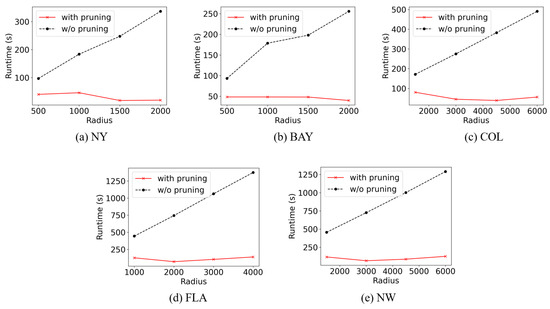 Secondly, we compare the runtime of the exact solution when the upper bound-based pruning technique is removed, i.e., we do not terminate the algorithm early and keep searching until all edges have been examined. Figure 9 reports the runtime of the exact solution with and without the upper bound-based pruning. As can be observed from the figure, when there is no pruning, the runtime increases as the radius increases. The gap becomes more obvious when the radius is large. When the radius is 2000, the exact algorithm with pruning is about an order of magnitude faster than the counterpart without pruning. This demonstrates the effectiveness of the upper bound.