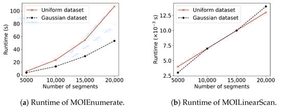 Runtime of MOIEnumerate and MOILinearScan vs. the number of segments.
