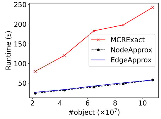 Scalability. Finally, in this set of experiments, we evaluated the scalability of the three proposed approaches. We used the largest road network NW and increased the number of spatial objects in the road network from 2,200,849 to 107,215,000. We used a fixed query radius of 1500 and report the runtime of the three approaches in Figure 11. As can be seen from the figure, all three approaches scaled well with respect to the number of spatial objects. This demonstrates the superiority of our proposed approaches.