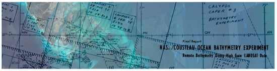 The concept of single-image SDB began in the late 1960s, and it has been investigated by international hydrographic offices over the past five decades []. In 1975, bathymetry in the Bahamas and off the coast of Florida was calculated to a depth of 22 m (72 feet) by NASA and Jacques Cousteau using Landsat 1 and 2 (Figure 1) []. The U.S. Navy used the GEOSAT satellite to create the first global bathymetric dataset of the deep ocean in the mid-1980s. Since then, depth determination methods have been developed based on data from active and passive satellite missions.