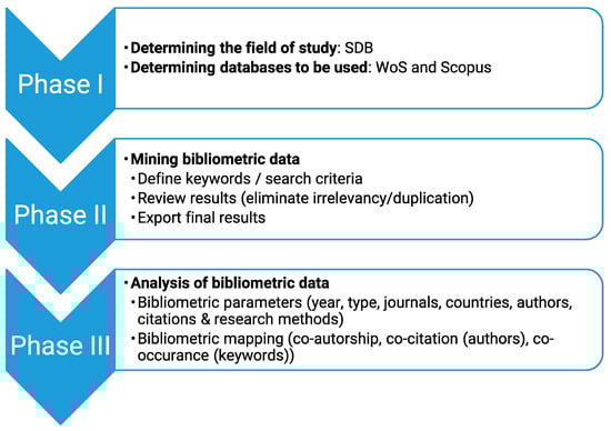 Systematic literature reviews and bibliometric studies provide a good methodological procedure that minimizes bias and errors when processing a particular scientific field of activity [,]. The proposed methodology of bibliometric analysis is structured in four phases that enable the full implementation of the analysis: (1) defining search criteria, keywords and time periods; (2) data compilation; (3) adjustment and improvement of criteria; (4) export and analysis of results [] (see Figure 3).