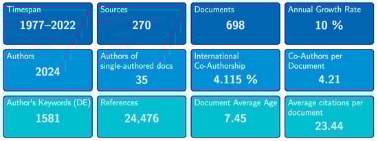 Selecting queries listed above included the optimal number of references from the WoS scientific database, and the same search parameters in the Scopus database have been repeated. In the search, 435 references were found for the search query in WoS, while a total of 567 references were obtained for the same query in Scopus. This difference occurs because most papers in WoS are articles, and there are a large number of conference papers among the Scopus references. The portage results of both databases were combined, and 304 duplicates were found. Before starting an analysis of the results, we combined the results using JabRef and Excel; after that, we filtered the data and eliminated duplicate results. The total number of unique references in Scopus and WoS is 698. Figure 4 shows the main information unified in the WoS and Scopus databases from Biblioshiny.