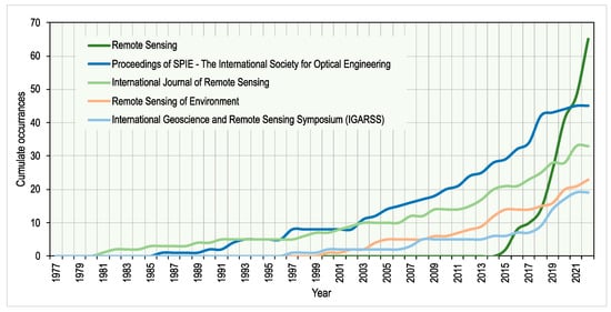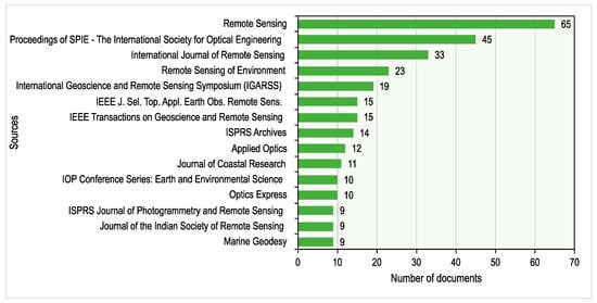 In the combined WoS and Scopus databases, we listed a total of 698 articles (documents) for optical SDB, where the WoS database mainly contains articles from scientific journals, while the Scopus database also contains a large number of conference papers. Three sources stand out from the rest in terms of the number of documents on SDB: Remote Sensing (online ISSN: 2072-4292) with 65 documents; Proceedings of SPIE—The International Society for Optical Engineering (ISSN: 0277-786X) with 45 documents; and International Journal of Remote Sensing (online ISSN: 1366-5901) with 33 documents. Other magazines published less than 30 articles. Figure 5 shows the dynamic of the cumulative number of documents in the top five sources over the years, while Figure 6 shows the total number of documents from the combined WoS and Scopus databases’ querying results that were published in each source so far. From 2014 to the present day, the Remote Sensing journal has recorded a significant growth in articles covering SDB topics—from 0 articles to a total of 53 in the year 2022. The Proceedings of SPIE—The International Society for Optical Engineering and International Journal of Remote Sensing had the largest number of papers in 2000, while in 2022, the Remote Sensing journal took the lead in the number of published articles from this scientific area.