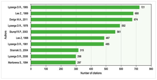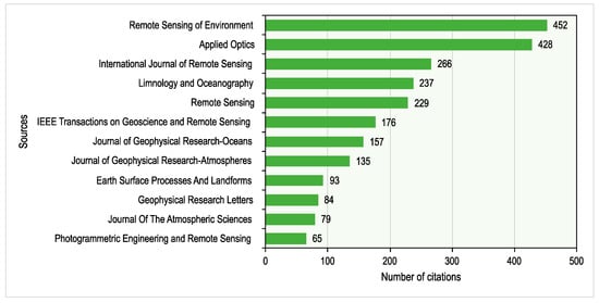 Figure 7 shows the number of local citations across sources, i.e., journals. Local citations are extracted from the reference lists of all 698 documents included in the unified WoS and Scopus database. They represent the number of documents that were cited in all 698 documents included in the analysis and are summed by sources. The top five sources by local citations are the following: Remote Sensing of Environment (online ISSN: 1879-0704) with 452 local citations is the first one, followed by Applied Optics (online ISSN: 2155-3165) with 428, International Journal of Remote Sensing (online ISSN: 1366-5901) with 266, Limnology and Oceanography (online ISSN: 1939-5590) with 237 and Remote Sensing (online ISSN: 2072-4292) with 229 local citations (Figure 7).