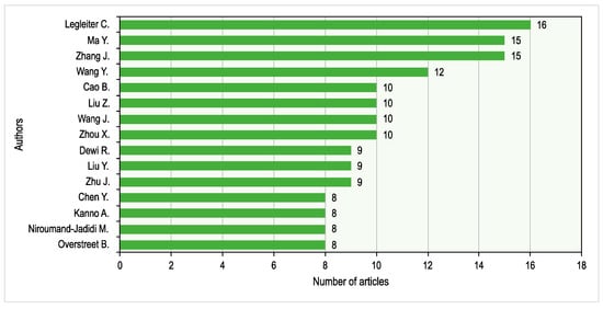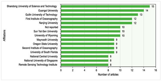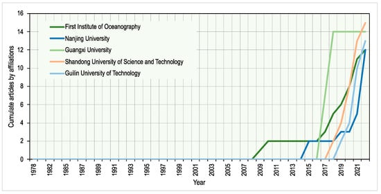 By analyzing affiliations, the most relevant affiliations by the number of articles are as follows: Shandong University of Science and Technology published 15 articles, Guilin University of Technology published 13 and First Institute of Oceanography and Nanjing University published 12 articles each (all from China; Figure 8). Considering the number of affiliations that have published articles dealing with optical SDB over time, it can be concluded that significant growth began in 2014 (Figure 9).