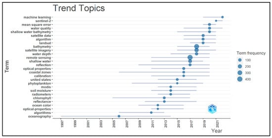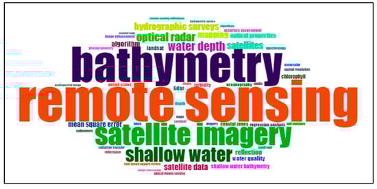SDB is a remote sensing method for bathymetrically surveying shallow waters, and its beginnings date back to the late 1970s and can be attributed to David R. Lyzenga’s article [] (Naval Architecture and Marine Engineering University of Michigan), which is cited 592 times. The frequency of SDB usage has considerably increased in the last decade.