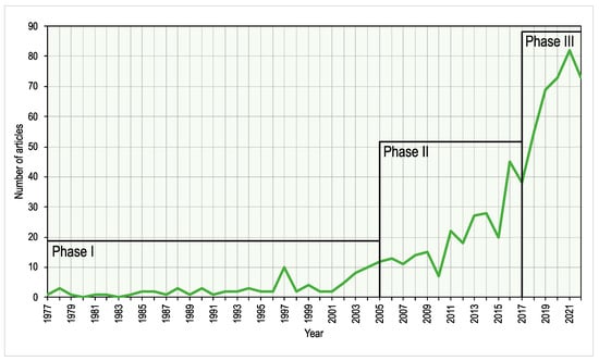 Bibliometric analysis has been used in recent years for the examination and statistical evaluation of the published scientific literature and for measuring the literature’s influence in the scientific community []. Bibliometrics applies statistical methods that study and investigate the quantitative properties and behavior of the content of scientific literature, which appeared in the 1970s and developed with the appearance of scientific databases and programs for processing bibliographic data [].