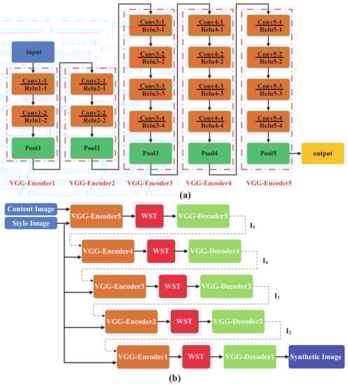First, the WST is added to and , and a synthetic image is generated based on the content and style images, as illustrated in Figure 3b. Then, is passed as a content image and style image through , the WST, and to generate the composite image . The final style transfer image is obtained iteratively. Because the features extracted by become more local as n increases, so , the style transfer of the images progressively expands from a local to a global level. Thus, the synthesized images finally obtained are of good quality.