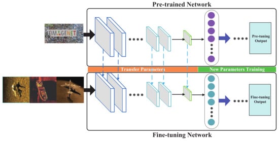 Deep networks are generally divided into a backbone and a head. The backbone network utilizes a CNN for feature extraction [,,], and the head network uses the features obtained from the backbone network to predict the target category. In target recognition using Transfer Learning (TL) methods, the backbone network is pre-trained on an external large-scale classification dataset (such as ImageNet []), and then, the head network is fine-tuned on the target dataset to alleviate the problem of insufficient target sample data. Pre-training on ImageNet has an advantage in general object recognition and is helpful for object recognition on small-scale datasets, such as those available for SSS [].