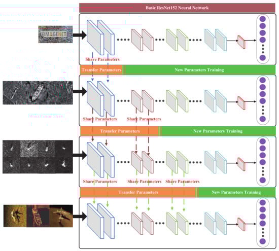 However, as noted in Challenge 1 in the previous section, for the classification of underwater SSS images, models pre-trained on optical images cannot achieve satisfactory results due to the significant difference between SSS images and optical images and the minimal size of the sonar image dataset used for training. Therefore, in this paper, different DL-based model network feature layers were trained using the optical, synthetic, real SAR, and SSS datasets. From the perspective of the number of samples in the dataset, the ImageNet dataset has about 1.2 million samples, the synthetic dataset about 20,000 samples, the SAR dataset about 9000 samples, and the SSS dataset about 1100 samples. Hence, this article trained duringthe process, and the network was trained in stages by adopting the dataset usage strategy with the number of samples from large to small to achieve the process of network transfer from a large sample dataset to small sample dataset and to solve the problem of the low recognition rate caused by insufficient sample data. From the perspective of data quality, ImageNet’s data quality is superior to the synthetic, SAR, and SSS datasets. Using the dataset strategy presented in this paper can allow the network to gradually adapt to changes in data quality. The problem of transfer learning failure caused by the difference between the optical and SSS dataset sample was solved. The feature layer of the network pre-trained using the optical dataset can extract basic features. The layer trained using the synthetic dataset has an improved ability to extract target features from a noisy background. The layer trained with the SAR dataset has the strongest ability to extract features under the background of interference because noise interference in SAR data is strong. Finally, the SSS dataset was used to train the remaining part of the network. The parameters of multiple models learned from the different modalities were transferred to the classification model of the SSS images for better low-level and high-level feature extraction and representation. The detailed multi-modal and multi-stage migration process is revealed in Figure 5. The details of the network training strategies are shown in Table 1.