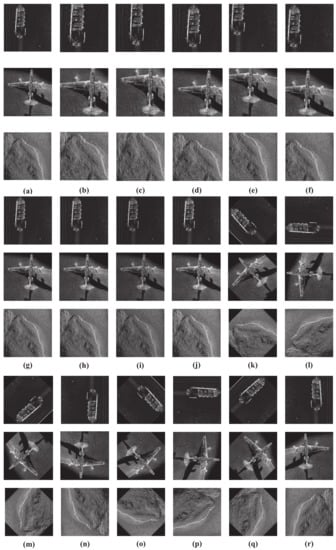 Random extraction was conducted for each image type, where 70% of the data were used for training data and 30% for testing. Table 1 lists the specific data allocation for each category. In order to reduce the influence of the random initialization of the parameters and the random sampling of the samples on the recognition effect, the average values of repeated experiments were used for the final evaluation of the recognition effect. The data types in the dataset were unbalanced, with the largest being the 578 other samples and only 66 plane samples. Unbalanced data will cause the classifier to favor categories with large sample sizes, and the recognition rate of small sample categories will be poor. At the same time, the total number of samples in the dataset was 1128, and the network trained using this dataset exhibited overfitting. In this experiment, to reduce the above problems’ impact on the algorithm, some basic data enhancement methods (flipping, rotation, cropping) were also applied to preprocess the data. These included cropping (center, bottom-left, top-left, bottom-right, top-right), equal-height or -width stretching, contrast transformations, rotation (45, 90, 135, 180, 225, 270, and 315), and left and right flipping. Figure 7 depicts the image transformation result. Figure 8 shows the image data used in the experiment. It indicates that different types of images have different appearances and distributions.
