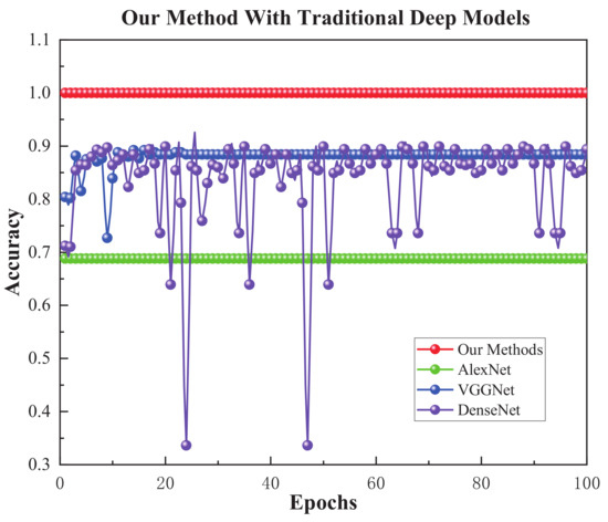Figure 7 demonstrates that the recognition accuracy of the proposed method was 95.92%, while the recognition accuracy of DenseNet was the lowest at only 91.63%, and the recognition accuracy of VGG was the highest at 95.5%. The proposed method had a recognition accuracy higher than 0.42%, 3.24%, and 4.29%, respectively. This method has a good recognition effect under strong noise interference.