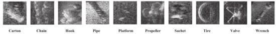 The proposed method can recognize SSS targets and be applied to FLS target recognition. In order to verify the effectiveness of the proposed approach in more categories of target recognition, this paper used Forward-Looking Sonar (FLS) data for the experiments. Among them, the total number of samples was 3192, the number of target categories 10, the number of training sets 2231, and the number of test sets 961. Figure 11 depicts the data sample diagram, whereas Table 8 displays the experimental results.