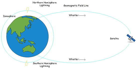 A lightning whistler wave is an electromagnetic wave in the very low frequency (VLF) range originating from a lightning flash. It propagates in the geospace through the ionosphere. At the source point, the lightning whistler is simultaneously emitted in the 1–10 kHz frequency range. The wave generally propagates along Earth’s magnetic field lines, as shown in Figure 1. After propagating and reaching the opposite hemisphere, a portion of the signal propagates down into the ionosphere. It can be detected on the ground, and some portion of the wave is reflected back to the ionosphere reaching the original hemisphere [10,11]. The propagation velocity is larger in the higher frequency range and becomes slower in lower frequencies, resulting in a dispersive spectrum, generally defined as dispersion. The propagation velocity depends on the electron density along the propagation path; therefore, the dispersive property strongly depends on the length of the propagation path and the TEC along the path.