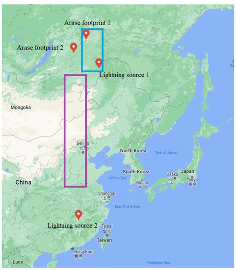 We found the source lightning candidate from the WWLLN database at latitude 52.28° and longitude 119.783° at 08:31:51.874189 UT, located near Russia. At that time, the distance between the Arase footprint and the lightning source point was around 667.3 km, as shown in Figure 6. The Arase footprint was taken using a magnetic field north trace with IGRF and Tsyganenko model [29].