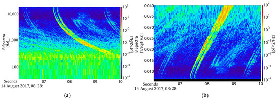 Lightning whistler observed by the Arase satellite on 14 August 2017 at 08:28:06–08:28:10 UT: (a) Dynamic power spectra of lightning whistler waves. (b) Converted dynamic power spectra of lightning whistler waves.