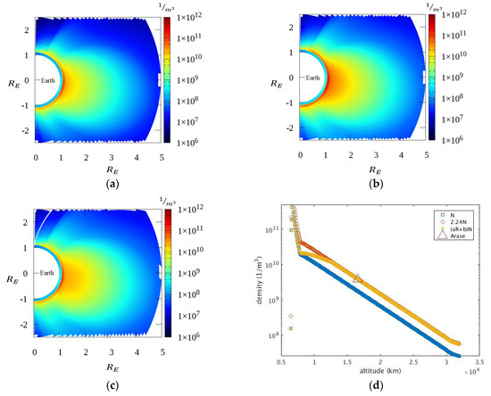 The density changes are shown in Figure 9. In Figure 9 there are three plots (a), (b), and (c) that show the reference electron density profile, modified electron density using , and the one modified by Equation (6), respectively. We generated the density for all regions, but Figure 9d shows for a particular slice at the geographic coordinate of longitude and 9°. The horizontal axis shows the altitude in km, and the vertical axis shows the electron density in/m3 with logarithm scale. The blue, orange, and yellow colors describe the electron density (0) or without modification, the modified electron density with constant c, and with Equation (6) at each altitude point, respectively. The electron density profiles at higher altitudes are all similar because the electron density is small. The density at the Arase location is shown with a purple triangle, which is .