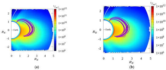 We calculated the ray path using these electron density profiles for all frequency ranges. This simulation can provide information on the direction, intensity, and time of arrival of the rays at different points in three dimensions. To see how the ray path passes the satellite position, we plotted the ray path in two dimension for a particular slice at longitudinal 120° as shown in Figure 10a–c. This shows the electron density profile in color contours and the ray paths at 5 kHz, 8 kHz, and 10 kHz under the modified electron density profile using Equation (6). The purple line describes the ray paths, and the black triangle indicates the location of the Arase. The different frequencies of the ray result in slightly different paths.