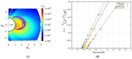 We then calculated the dispersion for each condition, as shown in Figure 10d. The propagation time of the ray paths under the reference electron density profile are slightly faster than the observation time, shown with the blue line, and the difference in the propagation time was much larger in the lower frequency range. After multiplying the density by a constant on modification function , shown with an orange line, the propagation time was much slower and the dispersion much larger than the observed propagation time and dispersion, respectively. In addition, any propagation time for the lower frequency range (<2 kHz) was identified as the ray paths passed away from the location of the Arase. The second adjustment, using Equation (6), resulted in a dispersion similar to the observation () and a propagation time at 10 kHz of 0.370238 s. The appropriate density modification met the propagation characteristics.