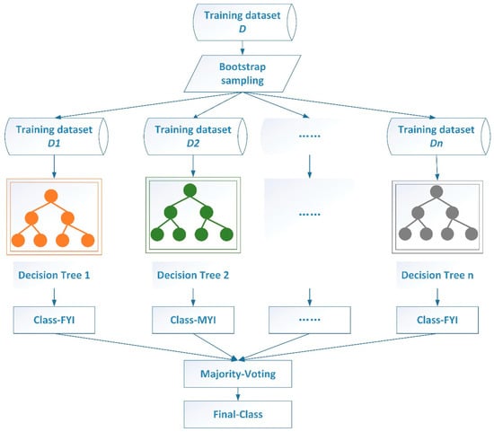 As for the first aspect, five machine learning classifiers, including logistic regression, naïve Bayes, random forest, gradient boosting, and support vector machine (SVM), have been evaluated for sea ice distribution in a previous study []. It was concluded that the random forest classifier is the best option for sea ice monitoring because of its high overall accuracy. Following the sea ice monitoring study in [], the random forest classifier is also used in this study []. It is a supervised learning algorithm that is used for both classification as well as regression. Figure 2 shows the structural schematic of the random forest classifier used in this study. It is a bagging algorithm with the decision tree as an estimator, the sample and feature parameters of which are randomly selected every time. A single decision tree is sensitive to the noise of the training dataset, but the random forest classifier can reduce the correlation between the trained multiple decision trees, effectively reducing the overfitting problem. In addition, the importance of variables can be assessed, and data scaling is not required in the random forest algorithm. The disadvantage of the random forest classifier is that it needs more computational resources, and the construction of the random forest is much harder and more time-consuming than the decision tree.
